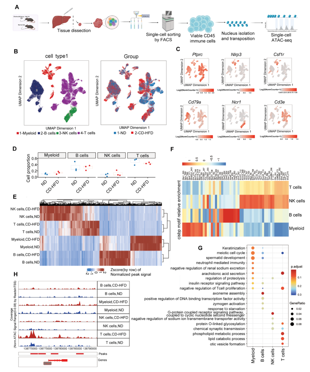 研究团队通过高脂饮食诱导的小鼠NASH模型,结合单细胞染色质可及性测序(scATAC-seq),对肝脏免疫细胞的组成和功能进行了系统解析。结果显示,随着NASH的进展,TH17细胞在肝脏中显著富集,成为炎症反应的核心免疫亚群。进一步结合单细胞转录组测序(scRNA-seq)分析发现,转录因子HIVEP1在TH17细胞中高表达。为验证其功能,研究者分别构建了TH17细胞特异性(Il17acre+;Hivep1fl/fl)和CD4⁺T细胞特异性(CD4cre+;Hivep1fl/fl)Hivep1敲除小鼠。实验结果表明,HIVEP1缺失显著降低了小鼠肝脏中TH17细胞比例,减轻了炎症反应,并减少了肝脏脂质沉积,提示HIVEP1在NASH发生和发展中具有关键作用。