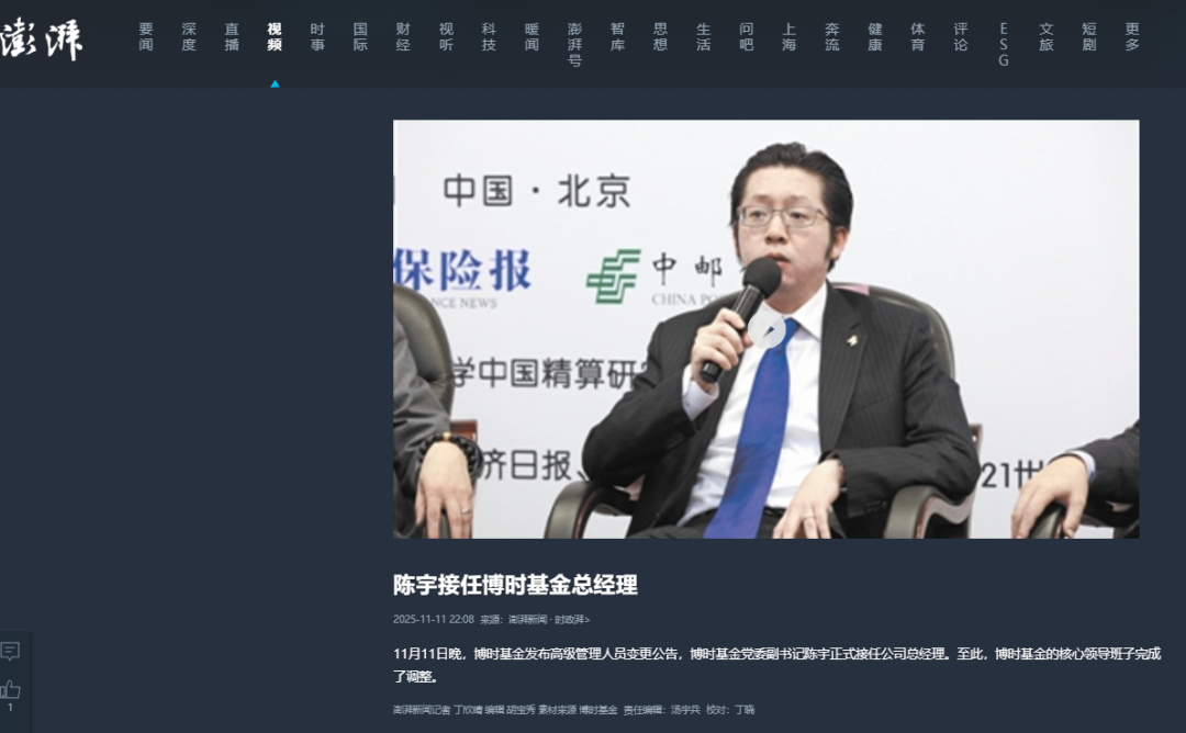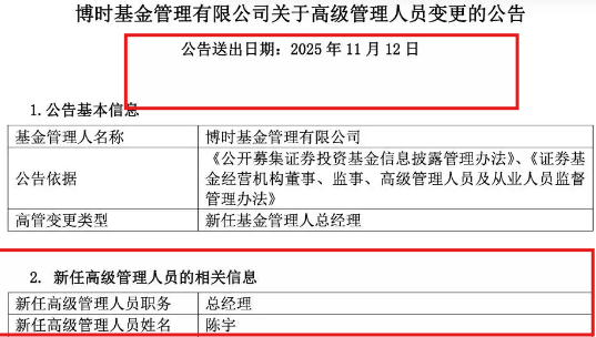 11月11日晚间,博时基金发布高级管理人员变更公告,无公募基金从业经验的陈宇正式接任公司总经理一职。