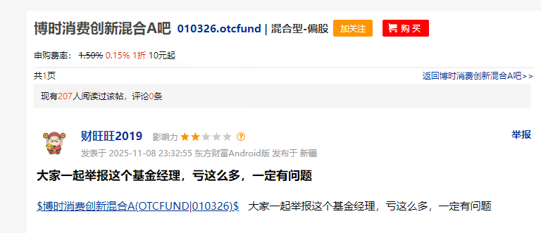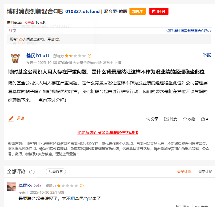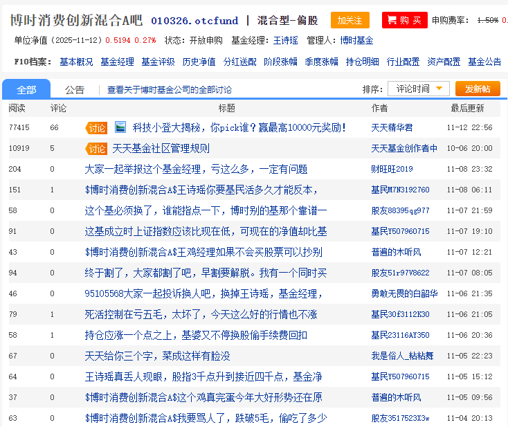 基民的愤怒已经从线上论坛溢出。在博时消费创新混合A的讨论区,基民留言,博时基金公司识人用人存在严重问题,要求撤换不作为的基金经理”;另有基民呼吁“联合起来维权”,控诉基金经理“在其位不谋其职”。
