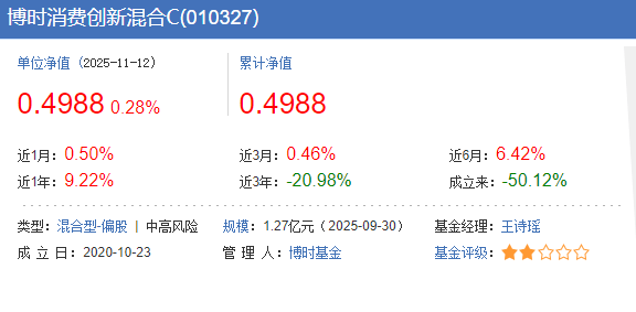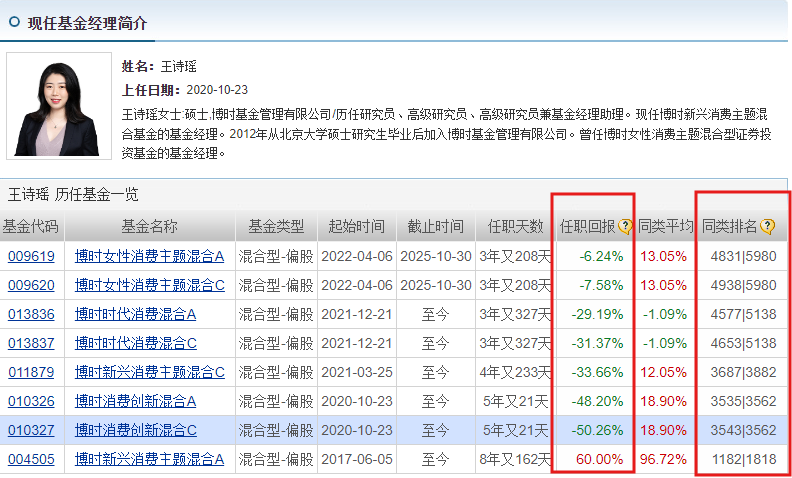 公开数据显示,王诗瑶管理的博时消费创新混合A(010326)自2020年10月23日成立以来,累计亏损48.20%;同系列的博时消费创新混合C(010327)成立来亏损更甚,达50.12%。